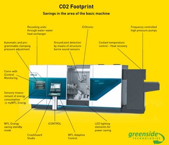 Greenside Technologies enables machines to be put into energysaving mode (the hydraulics, pneumatics, lighting, drive supply, cooling system, etc. are deactivated) during the production process (after completion of the workpiece in the commissioning) when they are not in use.