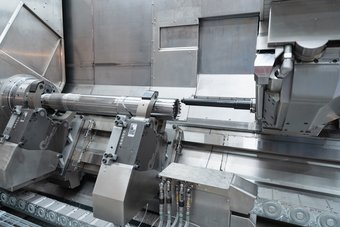 The modular system of the M150 MILLTURN has been expanded by revising the machine bed. The machine is ideally suited for workpiece weights of up to 25 tons, thanks to larger guide distances and dimensions and more powerful drives. The grinding of bearing points and roll-feed turning, a very efficient process for machining hard surfaces, where demonstrated on a roll from a steel mill. A large gearing with module 38 was milled at the right end of the workpiece. The workpiece did not have to be unloaded, but was measured directly in the machine. If necessary, a corresponding automatic correction is carried out for the programs and tools before finish-milling the gearing.