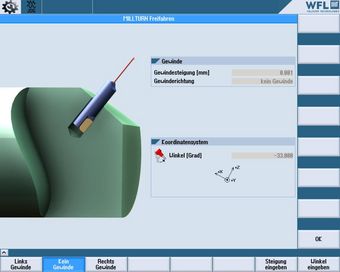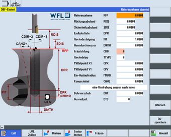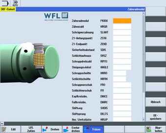 The technology cycles from WFL simplify programming considerably and are a direct route to achieving the desired production result. The wide range of technology solutions fulfils all machining requirements. The technology cycles are diverse, for example thread turning, grooves, thread undercuts, drilling with chip breaking, deep hole drilling, gun drilling, turn-, face or path milling and much more.