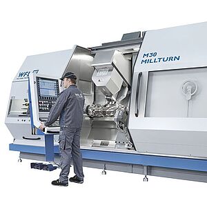 Los centros de torneado-taladrado y fresado multifuncionales M30/M35 y M30-G/M35-G Millturn permiten el mecanizado completo de piezas complejas de plato y ejes de hasta un diámetro de volteo de 520 mm y longitudes de mecanizado de hasta 2000 mm. Por tanto, es posible combinar la funcionalidad de un torno con la de un centro de mecanizado de 5 ejes, así como (en caso necesario) con la de una máquina talladora de engranajes o de taladrado profundo en un único medio de producción.