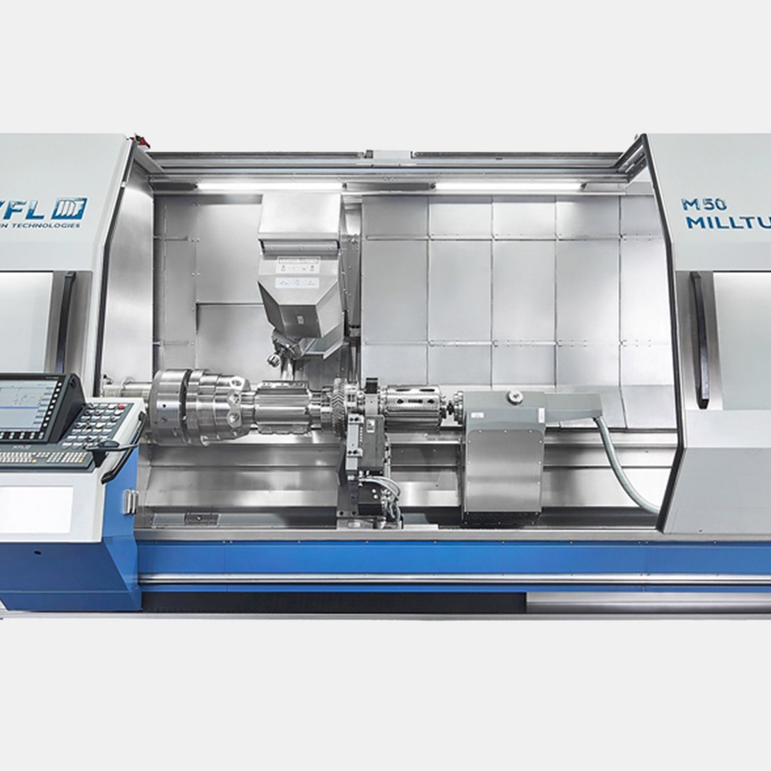 WFL dispone di oltre 20 modelli diversi di MILLTURN: grazie a una lunghezza di tornitura compresa tra 1000 e 14000 mm e a un diametro di tornitura compreso tra 520 e 2000 mm è possibile eseguire la lavorazione completa di una vasta gamma di pezzi. Quasi tutti i modelli MILLTURN sono disponibili anche come variante di contromandrino (con contrassegno G).