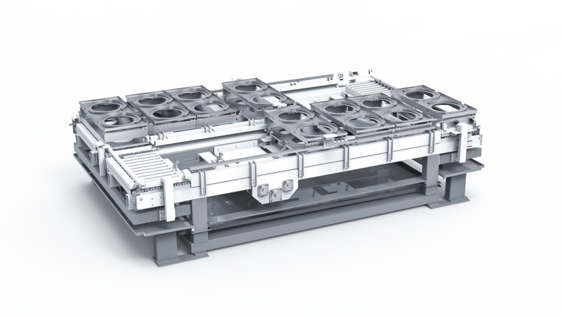 Esses suportes de peças de trabalho geralmente são paletes em uma ampla variedade de modelos. Eles são trazidos para a célula de automação em camadas individuais, empilhados ou em seus próprios carrinhos de transporte. Dependendo do projeto da área de alimentação, a troca de paletes pode ser realizada sem interrupção ou o dispositivo de manuseio pode se mover brevemente para uma posição de estacionamento enquanto o suporte da peça de trabalho é trocado. Dependendo do projeto, é possível obter aqui capacidades de armazenamento elevadas.