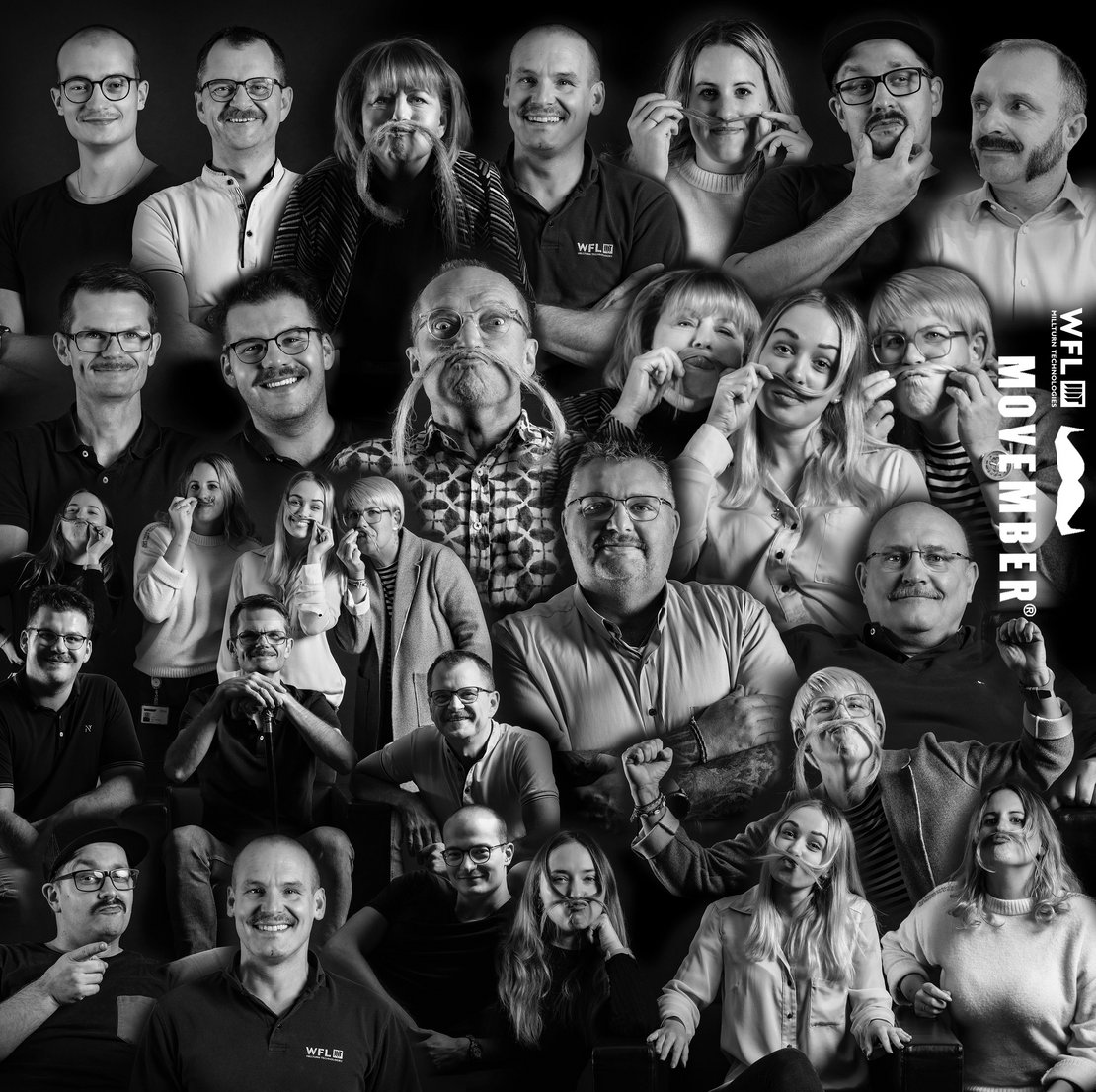 Funcionários da WFL e os bigodes! O bigode chama a atenção para a importância dos exames preventivos para os homens. A Movember também é uma comunidade ou fundação que arrecada recursos para causas importantes, como saúde mental, prevenção contra o suicídio, câncer de próstata e câncer testicular.