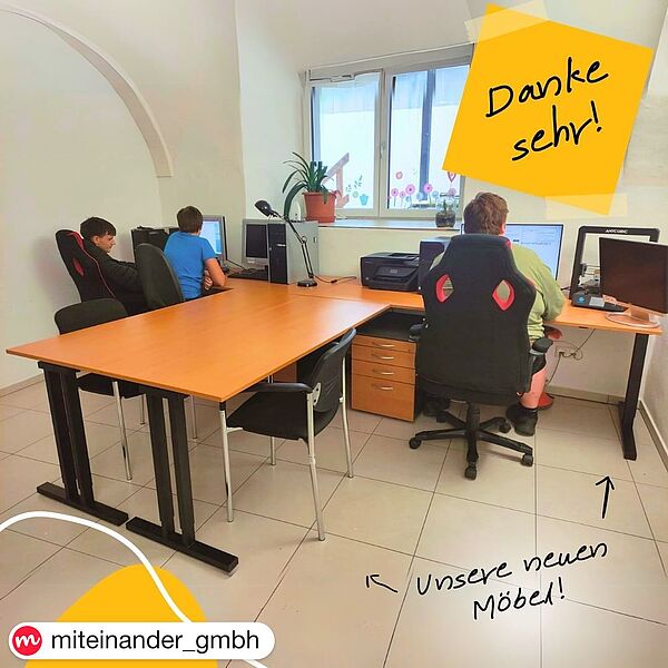 A WFL tem apoiado essa grande organização desde 2012, com doações como laptops e equipamentos de escritório. Mais uma vez, pudemos apoiar um projeto especial este ano. No verão, equipamos as localidades de Wels e Schärding com móveis de escritório. Como resultado, foram criados seis novos postos de trabalho para jovens em treinamento.