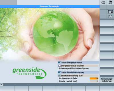 Durch Greenside Technologies ist es möglich, die Maschinen bereits während des Produktionsprozesses (nach der Fertigstellung des Werkstückes in der Inbetriebnahme) bei Nichtverwendung in den Energiesparzustand (Hydraulik, Pneumatik, Beleuchtung, Antriebsversorgung, Rückkühlanlage wird deaktiviert usw.) zu versetzen.