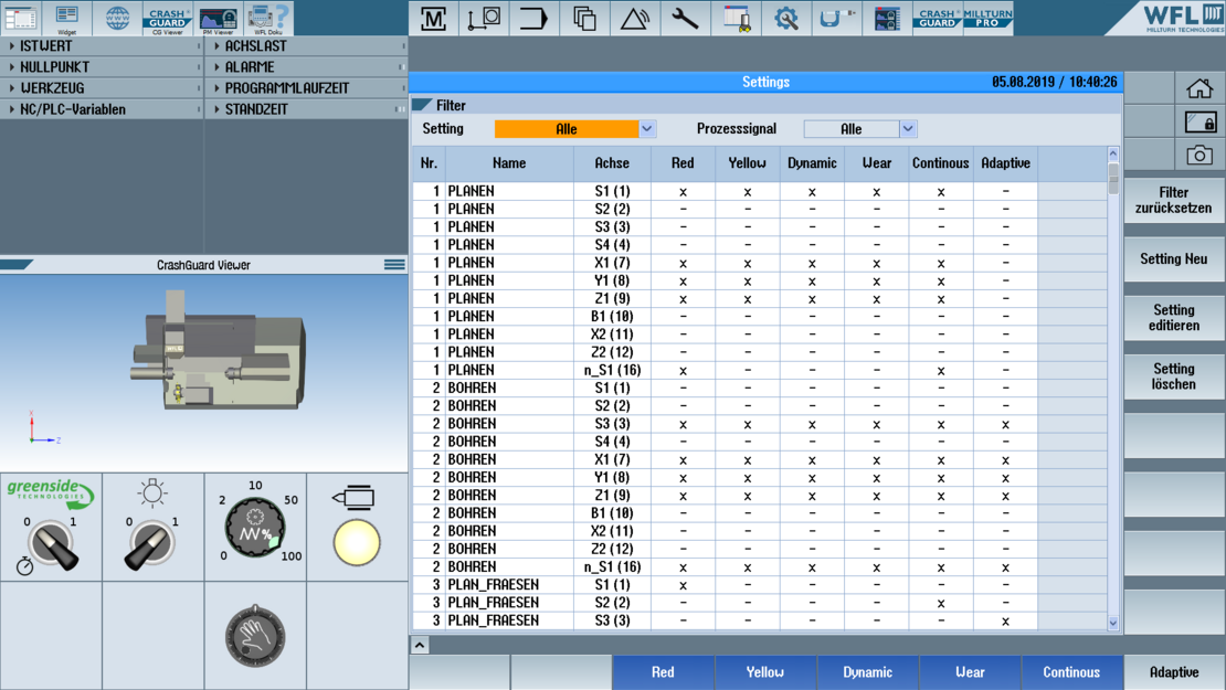 Je nach Maschinenausstattung werden fortlaufend bis zu maximal 16 frei konfigurierbare Prozesssignale beobachtet. Komplexere, intelligentere Überwachungsmöglichkeiten sind in der neuen Ausführung enthalten und bieten umfangreiche Sicherheit bei der Fertigung.