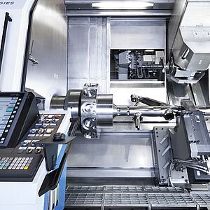 在双主轴机床中,所有中心距离(除了1000mm行程机床之外)都可用。为了提高生产力,可提供额 外的刀塔。由于机床的创新设计,底部导轨不需要任何可伸缩的防护罩。只需平直的不锈钢板就可使 切屑顺利流动。
