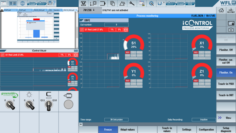With the fundamental new development of the in-house process monitoring, WFL has significantly expanded the range of functions. With the new “WFL iControl” system, process signals can be registered, evaluated and recorded in the CNC-kernel of the control with the highest sampling rate. The introduction of new monitoring strategies, such as so-called “yellow limits”, results in considerable advantages in tool breakage and tool wear monitoring. Another new feature is the option of integrating external sensors into process monitoring. The latter allows, for example, continuous monitoring and recording of performance data from coolant pumps or conclusions about the condition of spindle bearings.